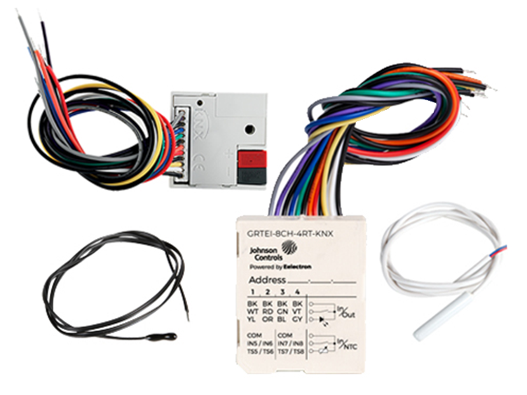 - Configurez les entrées 1 à 4 comme des sorties pour activer des LED de signalisation unique ou comme des entrées analogiques pour connecter des sondes de température NTC afin d'envoyer des mesures de température sur le bus, ou pour gérer quatre modules thermostatiques complets.